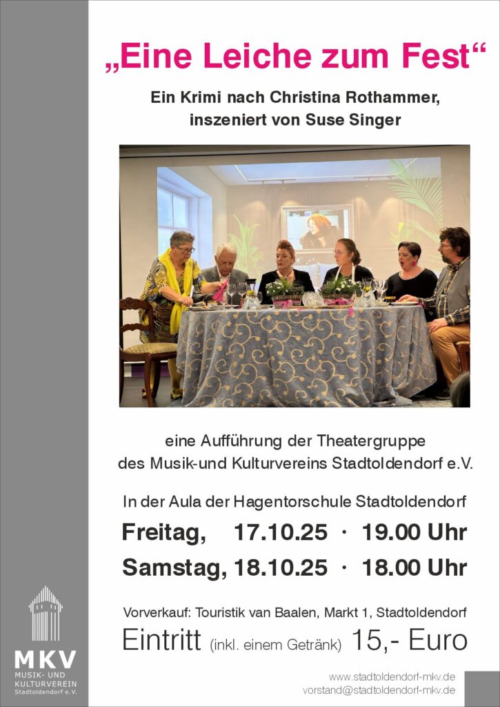 Freuen Sie sich auf dieses besondere Theater-Erlebnis und einen spannenden Abend voller Intrigen und Geheimnisse. Der Musik- und Kulturverein präsentiert das Krimi Theater “Eine Leiche zum Fest” am