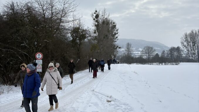 Gestartet wurde um 11 Uhr am Parkplatz des Restaurants Strauch’s, wo sich die Gruppe in geselliger Runde versammelte. Die Wanderung führte dann über die idyllisch verschneiten Feldwege am Fuß des Holzbergs. Selbstverständlich gab es unterwegs auch eine kleine Pause, um kurz zu verschnaufen, die Winterlandschaft zu genießen und sich mit Getränken zu stärken.