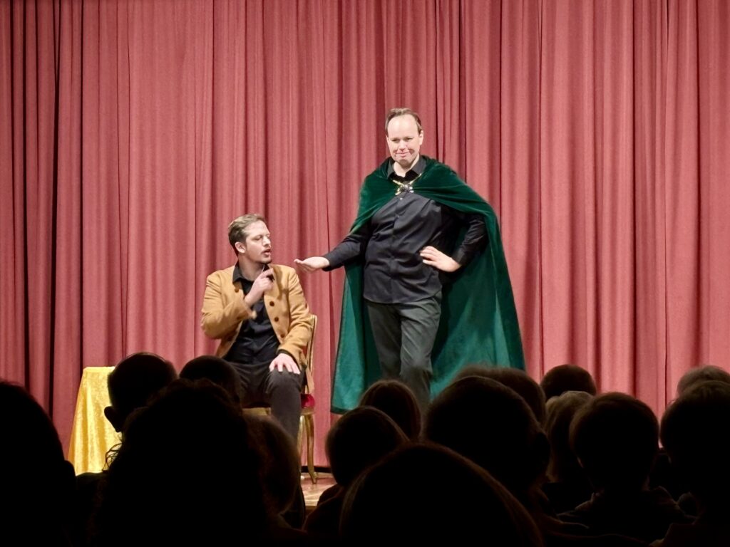 Vor restlos ausverkauftem Haus nahmen sie das Publikum mit auf eine Reise durch die bekanntesten Märchen der Brüder Grimm. Allerdings war hier nichts, wie man es kennt: Mit schrillen Tönen, schlagfertigem Wortwitz und einer Prise Absurdität verbanden die beiden Schauspieler die Geschichten auf ihre ganz eigene Weise und sprangen von Sterntaler über Schneeweißchen und Rosenrot zum Wolf und den sieben Geißlein. Dabei sorgten senile Großmütter, zickige Prinzessinnen und zudringliche Froschkönige für unzählige Lacher.